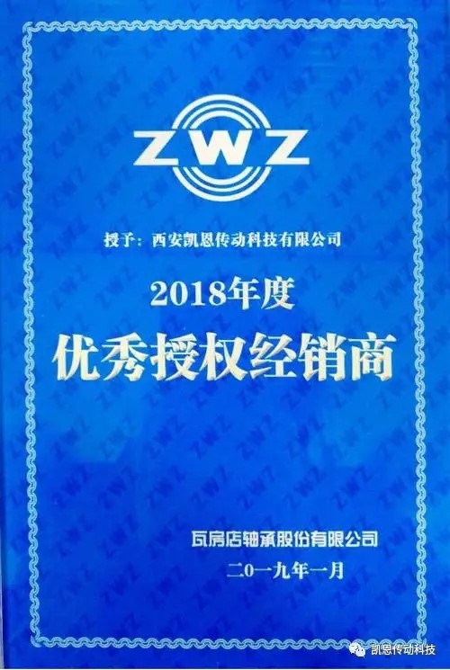 西安凱恩傳動(dòng)科技有限公司以“銷售高質(zhì)量的產(chǎn)品、優(yōu)良的服務(wù)和及時(shí)的供貨能力”而獲得業(yè)界的好評(píng)。2017年度被瓦房店軸承股份有限公司授予2017年度“優(yōu)秀授權(quán)經(jīng)銷商”稱號(hào)。